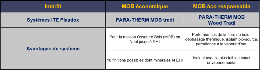 Pour les bâtiments en ossature bois (en neuf), deux systèmes sont proposés, du plus économique au plus éco-responsable. Le système Para-Therm MOB tradi est plus économique mais dispose d’un large choix de finitions dont minérales et EHI tandis que le système Para-Therm Mob Wood Tradi permet d’obtenir de meilleures performances de la fibre de bois tout en assurant un faible impact environnemental.